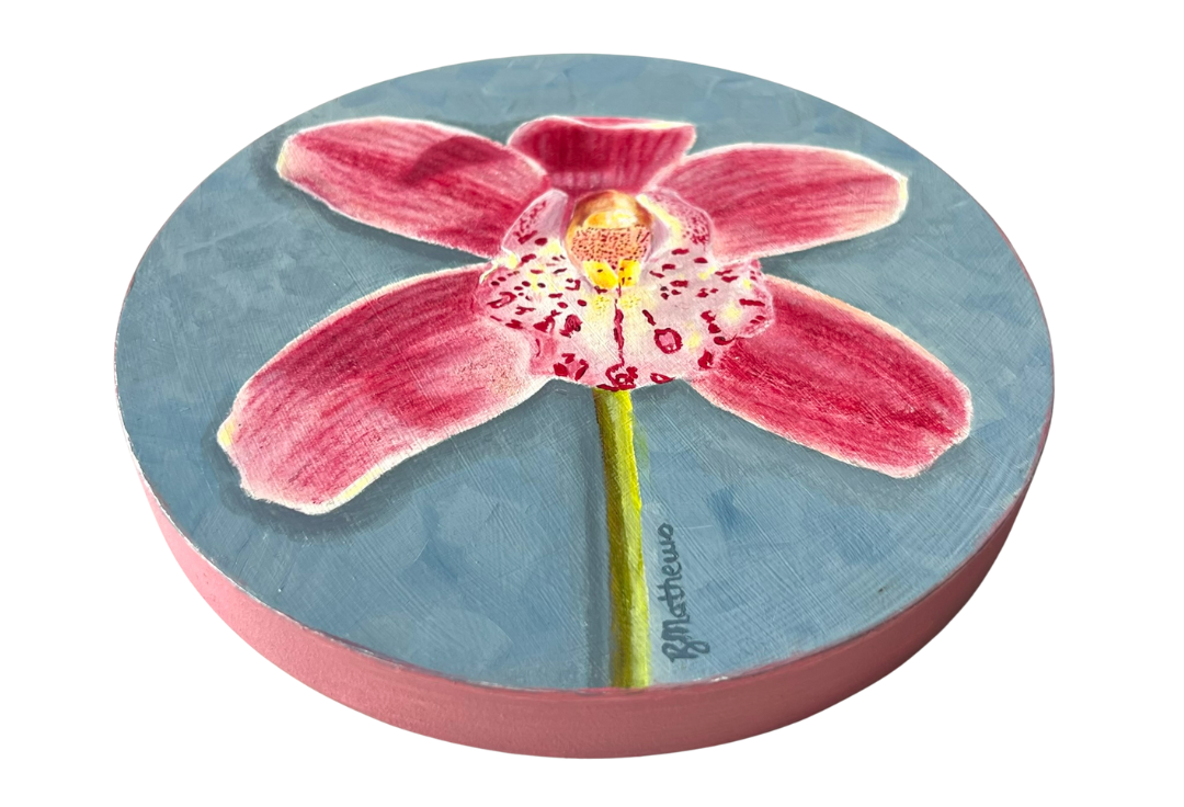 Each piece in the Pop of Joy series is fun, bright, and playful. The petals are layered with care and depth. Each background is chosen to complement the colours within the flower, and the edges are painted in the same colour as the bloom, creating a finished, cohesive piece.