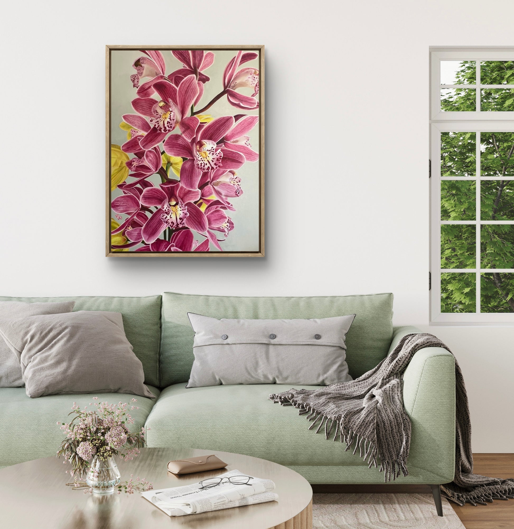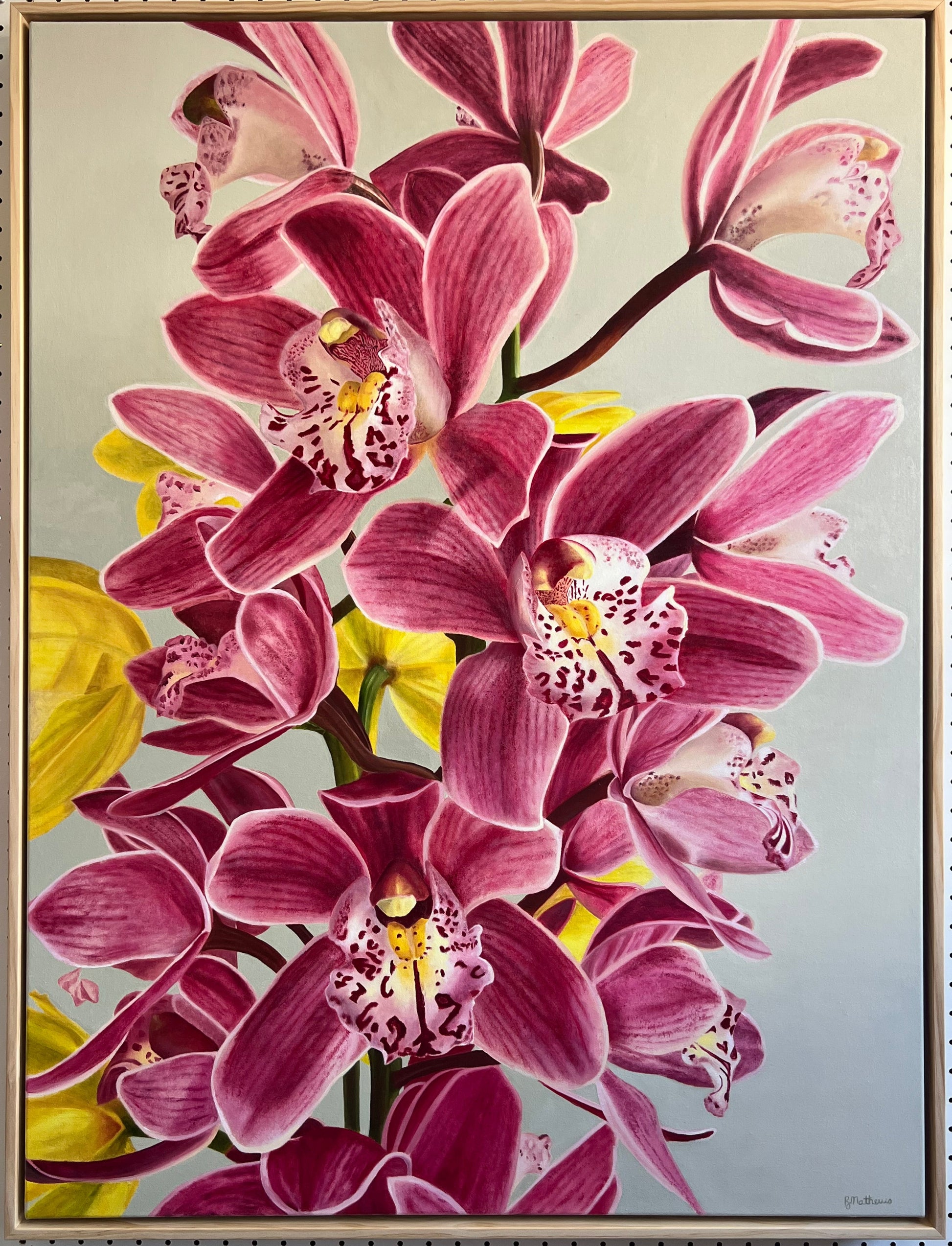 There’s a soft, sun-kissed, mottled glow across the petals, creating a gentle radiance that draws you in. The yellow flowers peek through just enough to balance the pinks, keeping the palette harmonious and uplifting. Set against a muted grey-green background, the piece remains delicate and soothing.