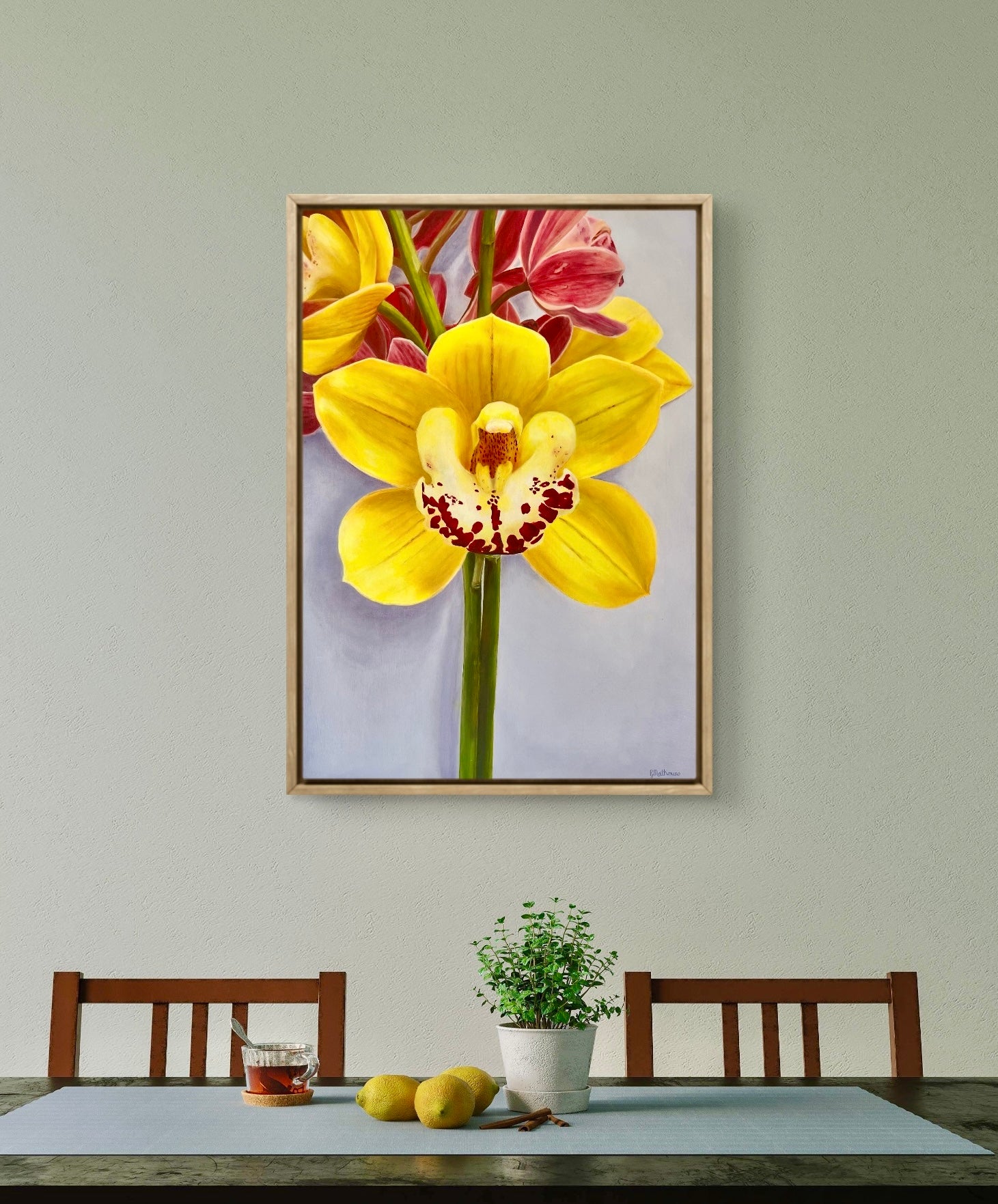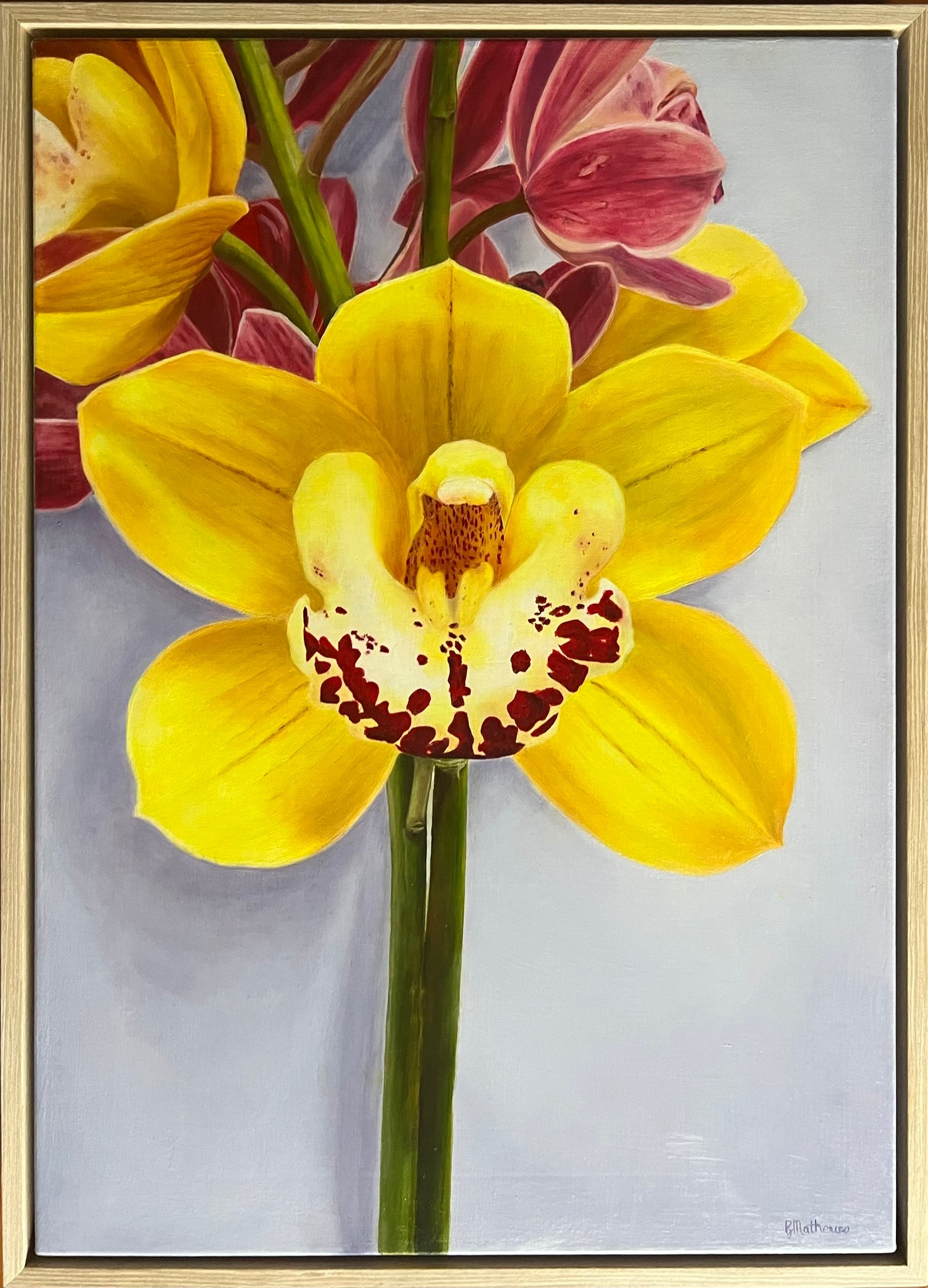 The yellow orchid takes centre stage, glowing with soft warmth and gentle detail. Behind it, the pink orchids sit quietly in the background, adding depth, balance, and a touch of softness to the palette. Together, they create a harmonious composition. The petals are layered with delicate detail and a luminous warmth that draws you in. The complementary background — Payne’s Grey with a soft purple bias — gives the bloom room to shine, keeping the palette balanced, fresh, and full of joy.